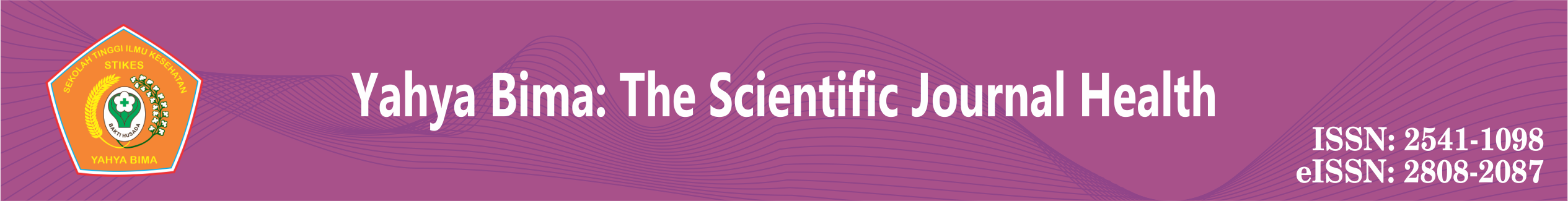 Yahya Bima : The scientific journal health merupakan jurnal yang berfokus pada ilmu keperawatan, Kesehatan dan kebidanan. dengan P-ISSN: 2541-1098 dan E-ISSN: 2808-2087. Jurnal ini mempublikasikan artikel-artikel ilmiah sebagai bahan bagi sesama akademisi dan praktisi profesional dalam menggali dan mengembangkan keilmuan.
